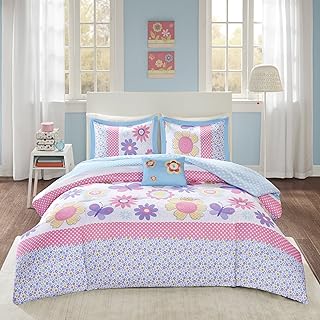 Comfort Spaces - Happy Daisy Kid Comforter Set - 3 Piece - Butterfly & Floral - Blue Pink - Twin/Twin XL Size, includes 1 Comforter, 1 Sham, 1 Decorative Pillow