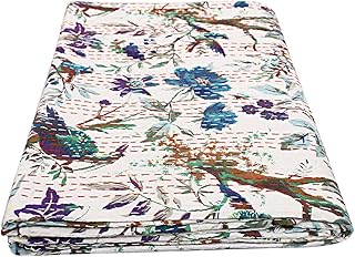 Janki Creation インディアンコットン カンタキルト ベッドスプレッド ツインサイズ ヒッピーボーホー寝具 ツインサイズ フローラルプリント カンタステッチ 60 x 90インチ カンタキルト カンタベッドカバー カンタベッドカバー