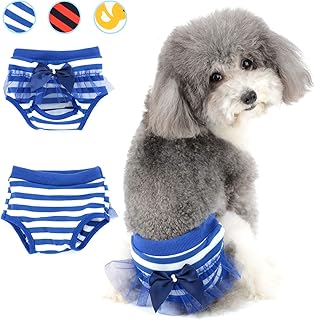 Ranphy 犬オムツ 犬用サニタリーパンツ 縞柄 生理用 パンツ 女の子用 おむつ 可愛い 女の子用 蝶結び付き レース付き しっぽ穴付き オムツカバー ドッグウェア ソフト 洗える 再利用可能 雌犬用 発情期用 犬の尿失禁対策 月経期 介護用 メス犬用 マナーベルト ペット用生理パンツ お出かけ 散歩 しつけ用品 ブルー S