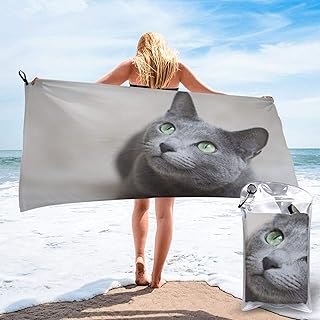 DADABULIU バスタオル 薄手 ボディタオル ビーチタオル 大判 ロシアンブルー ネコ 猫 猫柄 灰色 マイクロファイバー 速乾 ふわふわ 高速吸水 サイズ:70cm×140cm 収納袋付き ループ付き 家庭用 旅行 かわいい おしゃれ