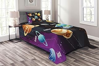 Ambesonne 宇宙 ベッドスプレッド 太陽系 天の川 海王星 金星 水星 球体 イラスト 装飾キルト 2ピース カバーレット セット 枕カバー付き ツインサイズ ブラック パープル