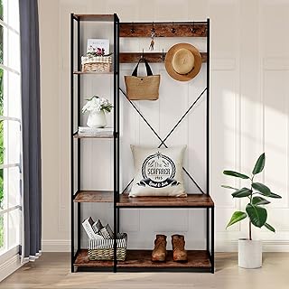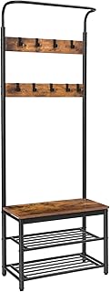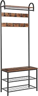 Allewie コートラック 靴ベンチ 玄関用収納棚付きホールツリー 工業アクセント家具 スチールフレーム 3イン1デザイン 素朴なブラウン