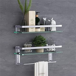 VOLPONE ガラスバスルームシェルフ タオルバー付き ガラスフローティングシェルフ タオルラックホルダー付き 壁取り付け式ガラスシャワーシェルフ(2段、シルバー)