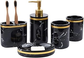 Meltset M バスルームアクセサリーセット 5個 フェイクマーブルルック ポリレジン バスルーム装飾 - 歯ブラシホルダー ローションポンプ ディスペンサー ソープディッシュ トレイ 浴室 タンブラー カップ 豪華なギフトセット (ブラック)